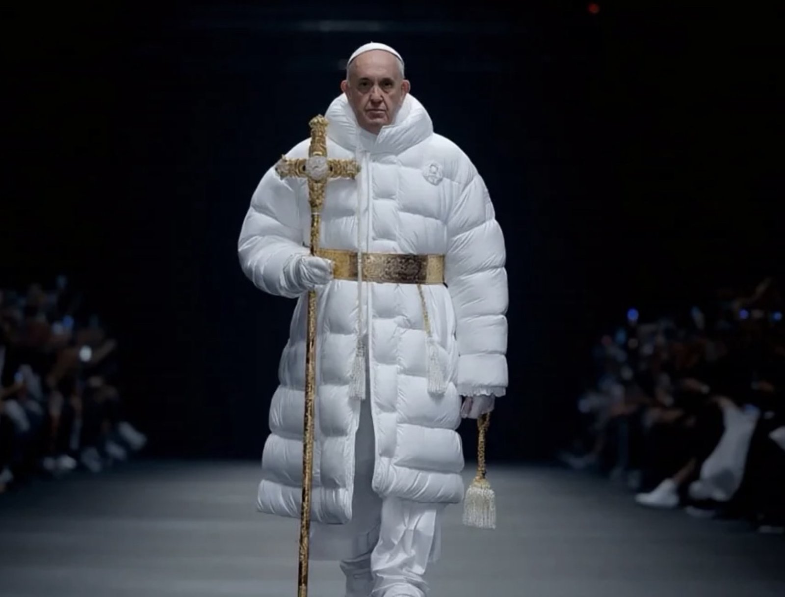 The show kicked off with none other than Pope Francis, who appeared dressed in an ensemble that can only be described as divine haute couture. Clad in a white Balenciaga-like puffer coat that could double as a luxury sleeping bag, the Pope’s outfit was cinched at the waist with a gold belt that screamed “Vatican bling.” To complete his look, he carried a large, ornate cross in one hand and a holy water sprinkler in the other, because why not?